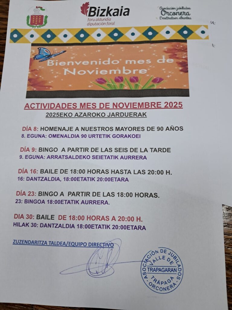 - DÍA 10: BAILE EN EL CLUB DE 18:00 A 20:00 HORAS (10. EGUNA: DANTZA KLUBEAN 18:00ETATIK 20:00ETARA) DÍA 15: LUNCH DE ANIVERSARIO DE LOS 30 AÑOS DE LA EMPRESA URGATZI, VIERNES A LAS 14:30 h. con música en directo.